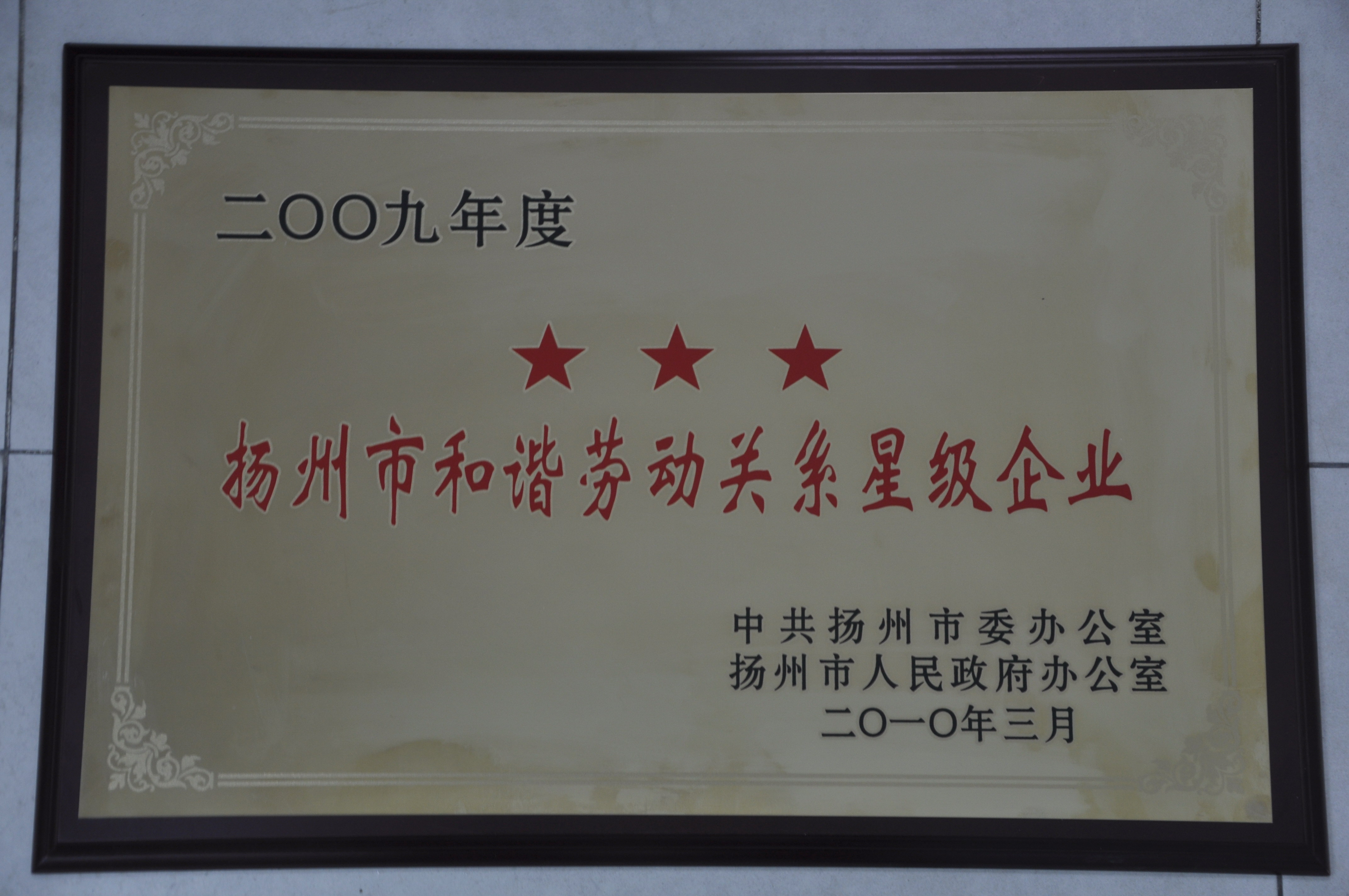 您現(xiàn)在的位置:首頁(yè) > 榮譽(yù)之窗 > 集團(tuán)公司獲2009年揚(yáng)州市和諧勞動(dòng)關(guān)系“三星級(jí)企業(yè)”殊榮