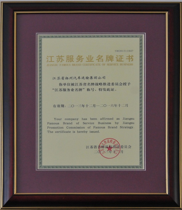 近年來,公司積極貫徹省政府關于加快現(xiàn)代服務業(yè)發(fā)展的要求,大力實施文化與品牌發(fā)展戰(zhàn)略,始終堅持把爭創(chuàng)企業(yè)名牌、推進揚汽品牌發(fā)展作為一項系統(tǒng)工程來抓,堅持品牌建設與品牌經(jīng)營相結(jié)合,提升“揚汽品牌”的市場知名度,促進企業(yè)健康穩(wěn)定持續(xù)發(fā)展。2013年在申報江蘇服務業(yè)名牌工作過程中,公司依據(jù)《江蘇省名牌產(chǎn)品管理辦法》規(guī)定,圍繞企業(yè)領導、戰(zhàn)略、顧客與市場、資源、過程管理、測量分析與改進以及經(jīng)營結(jié)果等七個方面考評內(nèi)容進行系統(tǒng)申報,自2013年7月開始,歷時數(shù)月,經(jīng)嚴格篩選最終當選。