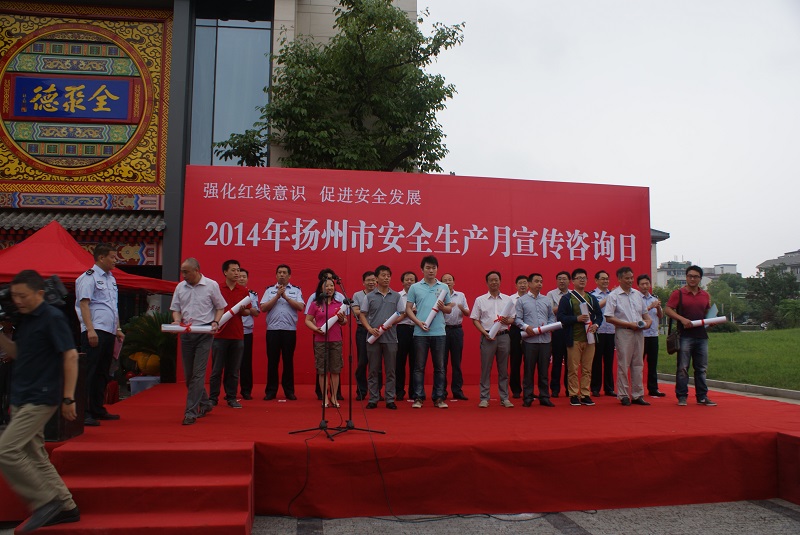6月16日上午,揚州市安委辦會同蜀崗—瘦西湖風(fēng)景名勝區(qū)管委會在虹橋坊舉行了以“強(qiáng)化紅線意識,促進(jìn)安全發(fā)展”為主題的2014年揚州市“安全生產(chǎn)月”宣傳咨詢?nèi)栈顒印J邪参瘯、市安監(jiān)局、蜀岡—瘦西湖風(fēng)景名勝區(qū)管委會、市人保公司負(fù)責(zé)人出席了活動。市安監(jiān)局、揚汽集團(tuán)、市城建控股集團(tuán)、市工藝美術(shù)集團(tuán)、金茂化工集團(tuán)、揚子江集團(tuán)、建工控股集團(tuán)等11家單位以及消防、建筑、燃?xì)狻庀、質(zhì)監(jiān)、部分駐揚單位的職工代表共計400余人參加了活動。