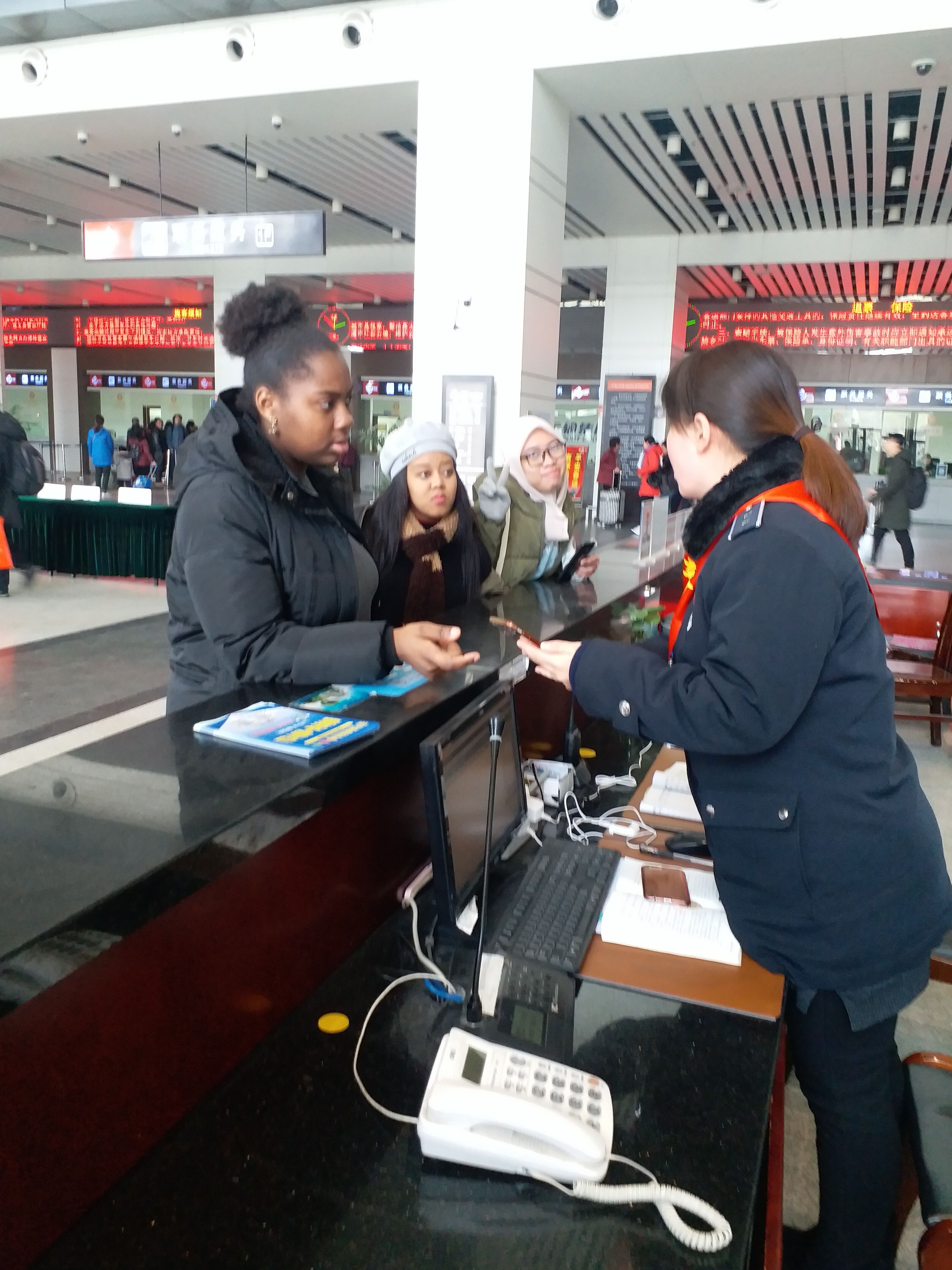 下午12時30分左右,來自揚大的南非和印尼的三位女留學(xué)生,來到車站,想乘車去南通與同鄉(xiāng)會面,到了車站后,才發(fā)現(xiàn)去南通需要到揚州汽車東站乘車,而且班次的時間在兩點,一時性急的三位留學(xué)生沒了主意,操著生硬的中文,來到服務(wù)臺求助。服務(wù)臺工作人員尹海霞熱情地幫助她們查詢了發(fā)往南通的大巴班次,立即為她們購買了已經(jīng)為數(shù)不多的車票?紤]到時間比較緊,尹海霞又將她們帶到公交上客區(qū),送她們上車,趕往東站。印尼的留學(xué)生上車時豎著大拇指說道:“車站漂亮,人更漂亮!”