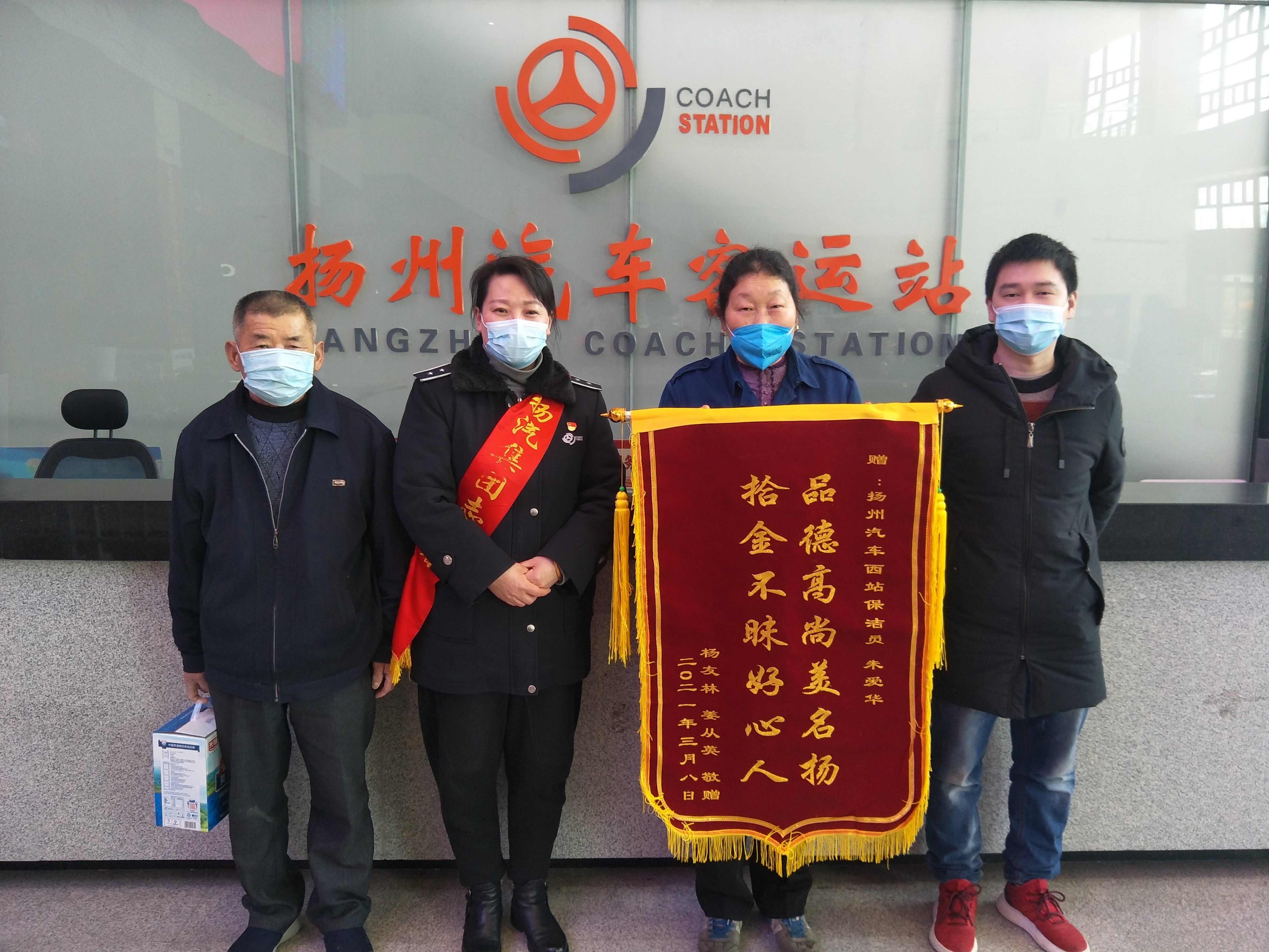 “品德高尚美名揚(yáng),拾金不昧好人心”,3月22日上午,揚(yáng)州汽車站收到一面來自旅客的錦旗,對車站保潔員朱愛華拾金不昧的品德和工作人員熱情周到的服務(wù)表示了高度贊揚(yáng)和誠摯感謝。