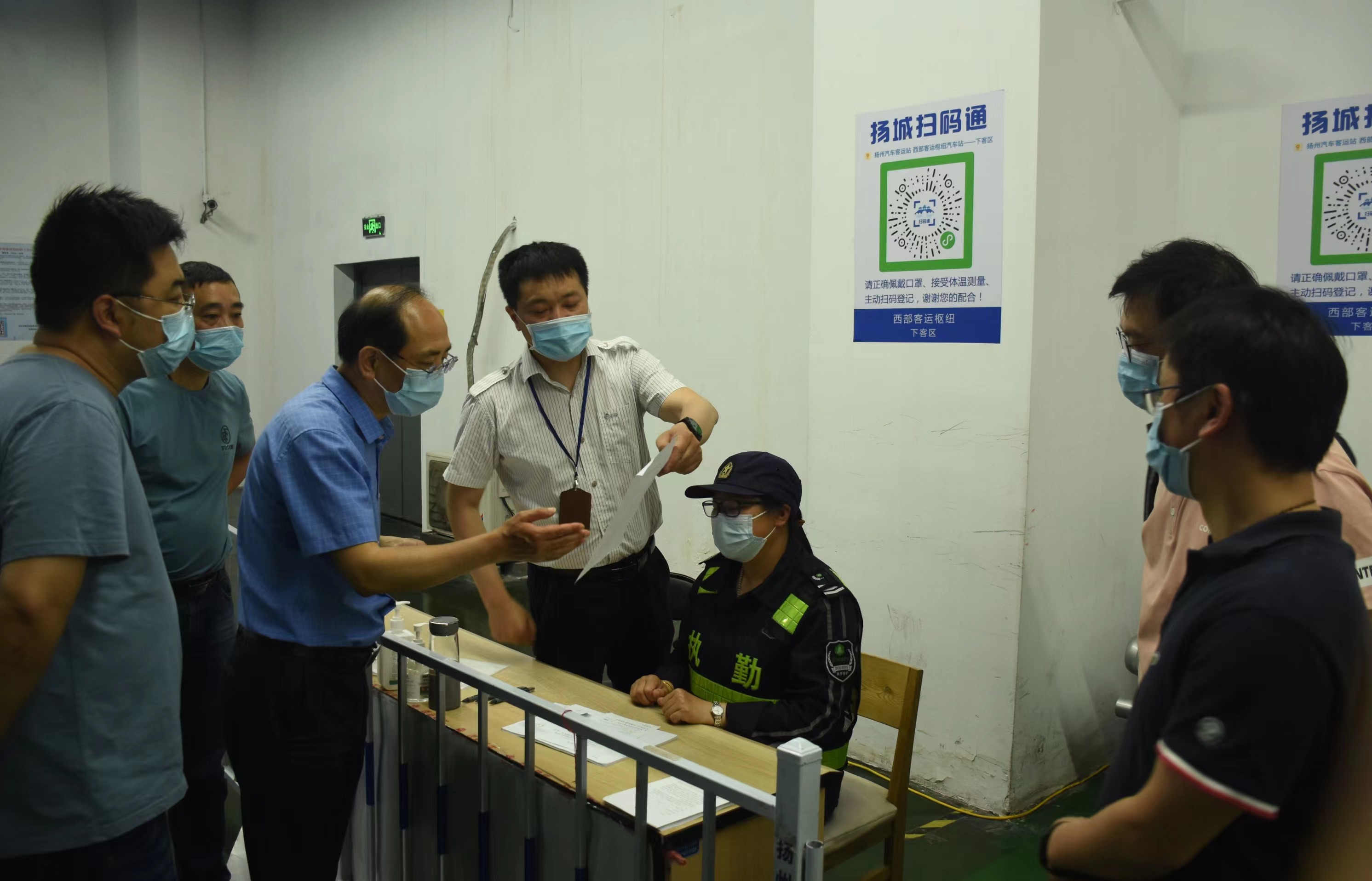 陳家宏一行實地查看了旅客進站口、售票大廳、下客區(qū)出站口等區(qū)域,通過聽取匯報、溝通交流、翻閱資料等方式詳細了解了揚州汽車站現(xiàn)階段疫情防控工作的落實情況。